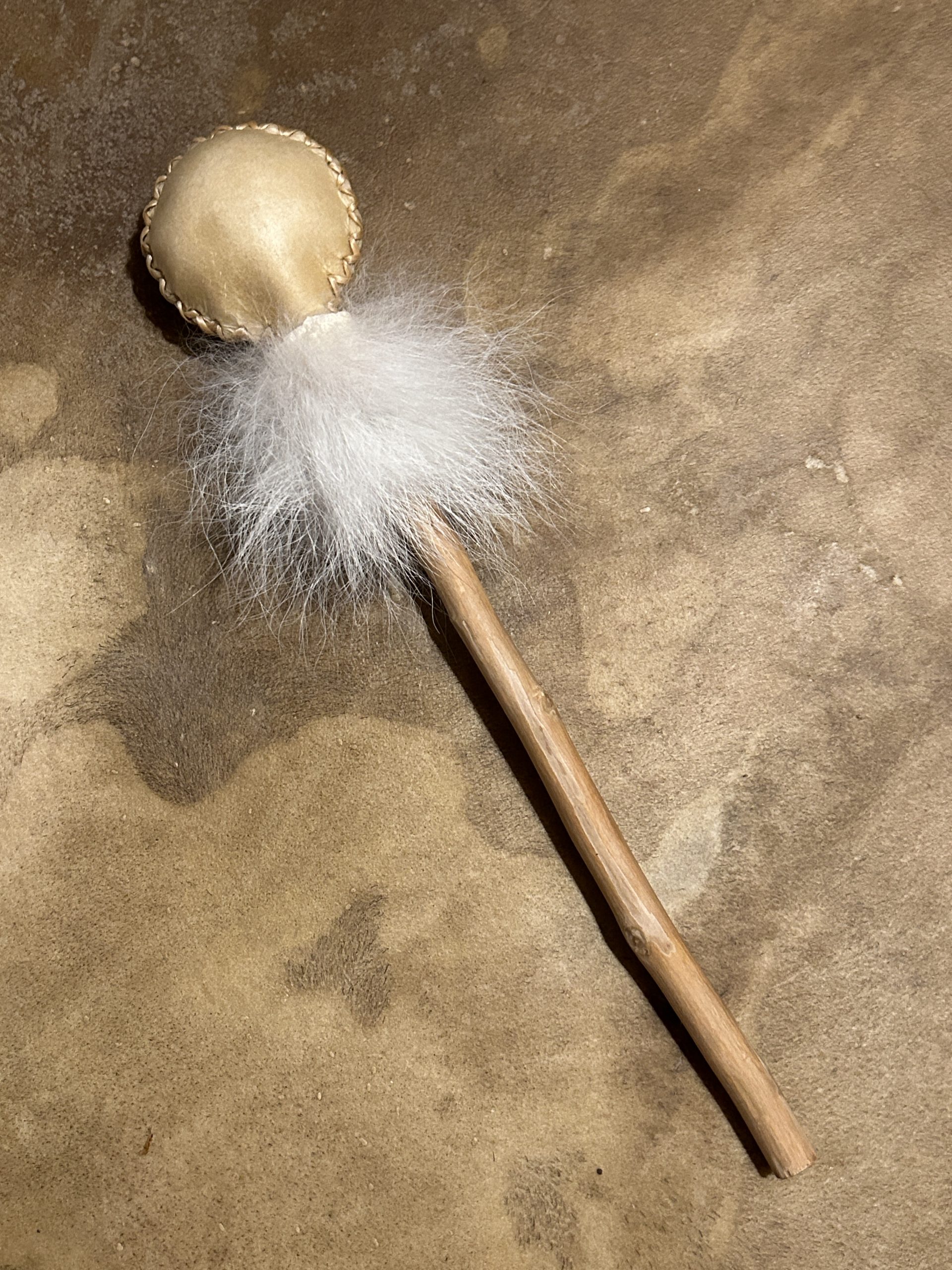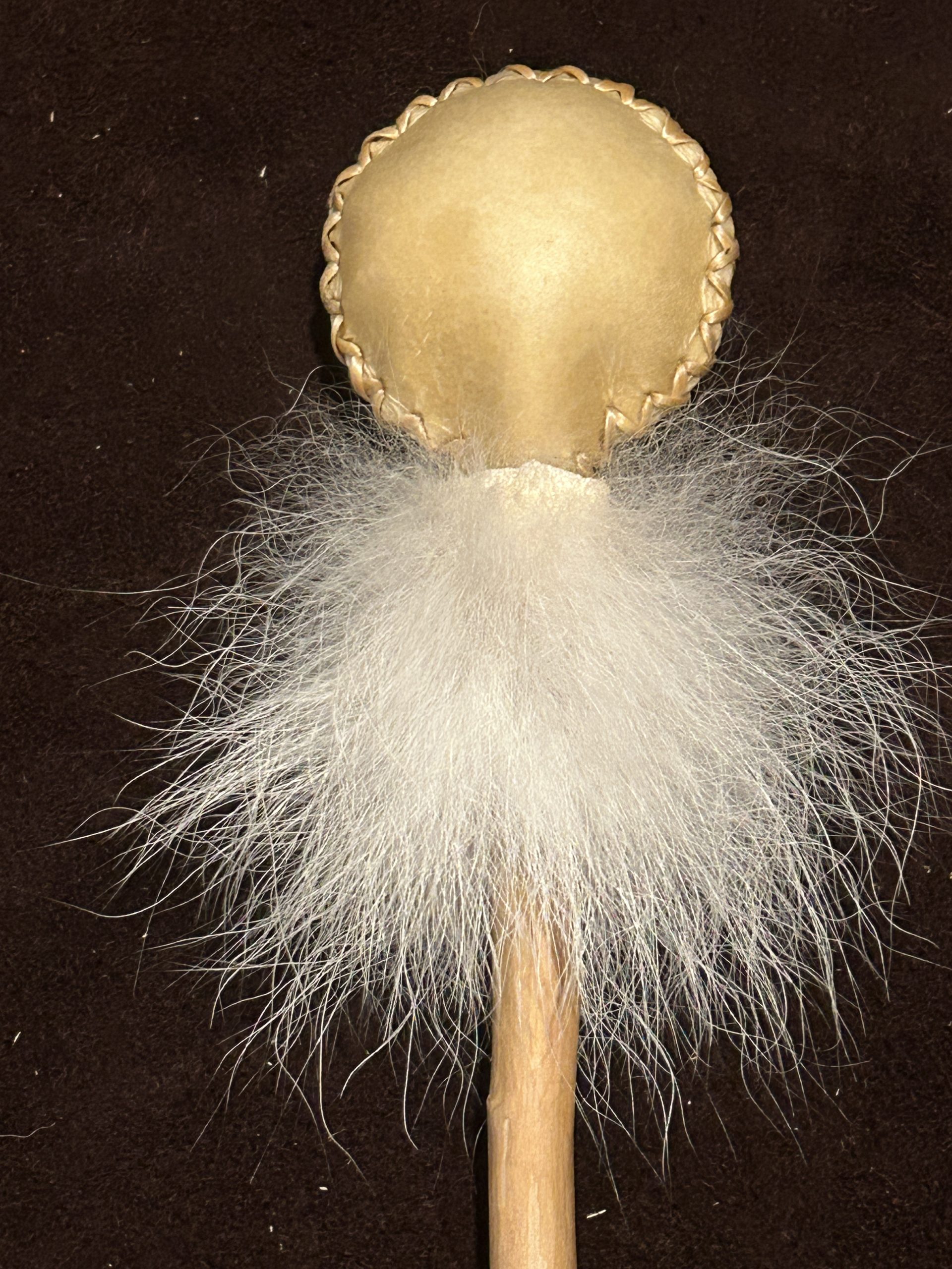The head is 2-1/4″ across and the birch stick has a rabbit fur trim. 12″ overall length